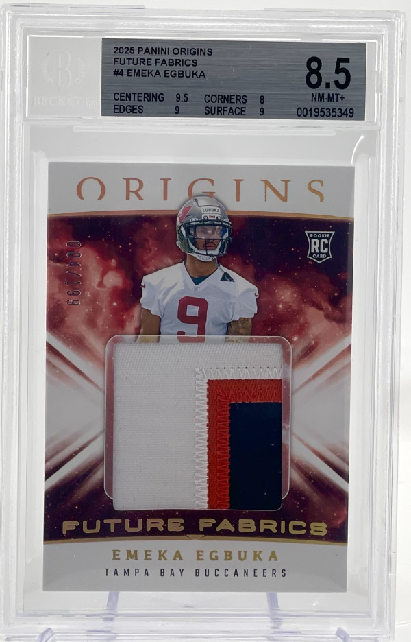 The product is a 2025 Panini Origins Emeka Egbuka Future Fabrics 3 Color Patch Jersey Relic Rookie Card #155 out of 199. This sports trading card features a patch of jersey relic from the player, Emeka Egbuka, who is part of the Tampa Bay Buccaneers in the National Football League (NFL). The card is graded 8.5 by Beckett Grading Services (BGS) and is an original print made of card stock. It is a serial numbered short print with a parallel/variety design, making it a valuable collectible for football fans.