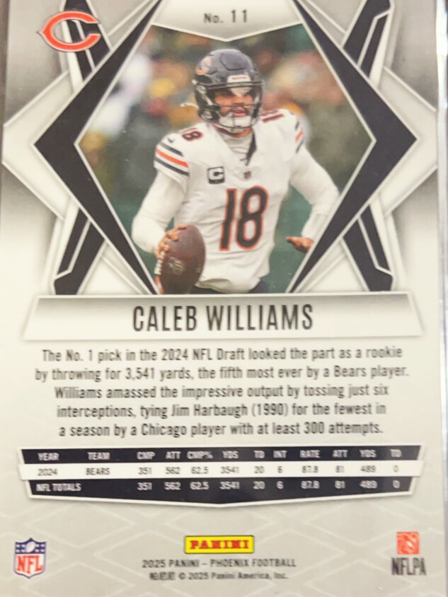 You are purchasing a 2025 Panini Phoenix Football Caleb Williams #11. You will receive the exact item in the photographs. Thank you for looking.