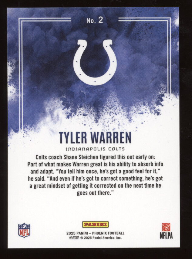 You are purchasing a 2025 Panini Phoenix Football Tyler Warren #2 Color Blast RC. You will receive the exact item in the photographs. Thank you for looking.