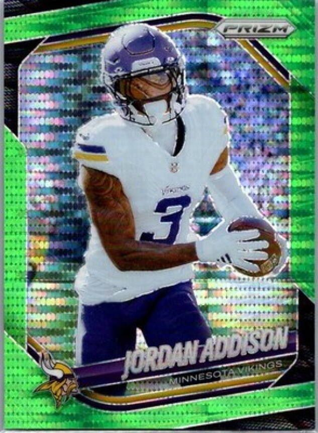 This is a nice example of a 2025 Panini Prizm #19 Jordan Addison Neon Green Pulsar