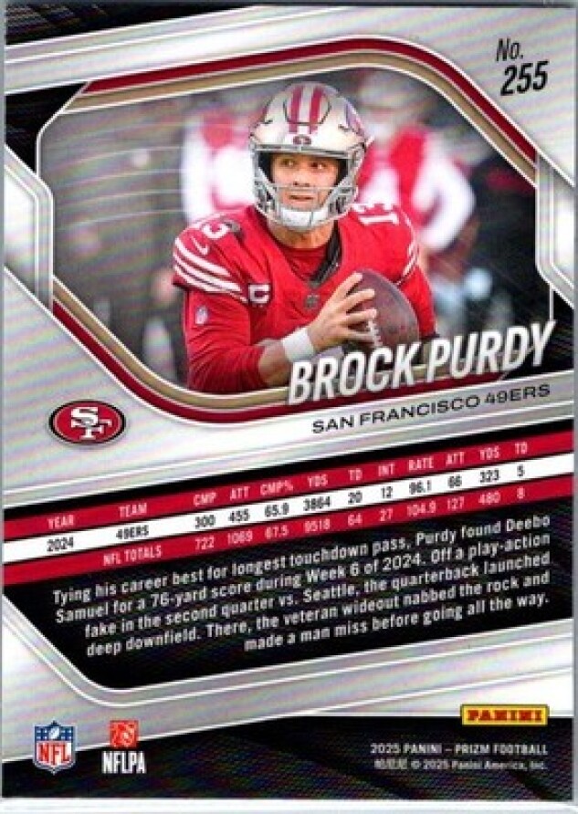 This is a nice example of a 2025 Panini Prizm #255 Brock Purdy