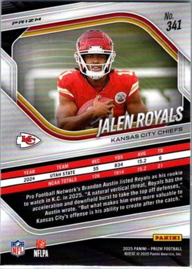 This is a nice example of a 2025 Panini Prizm #341 Jalen Royals Silver