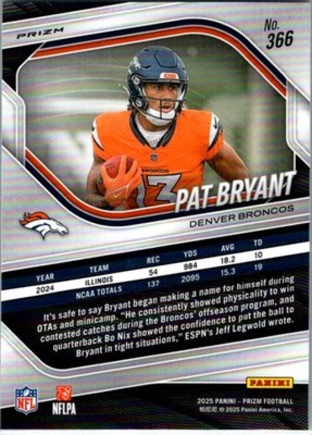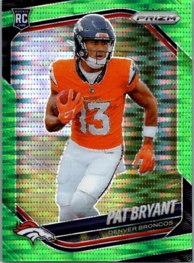 This is a nice example of a 2025 Panini Prizm #366 Pat Bryant Neon Green Pulsar