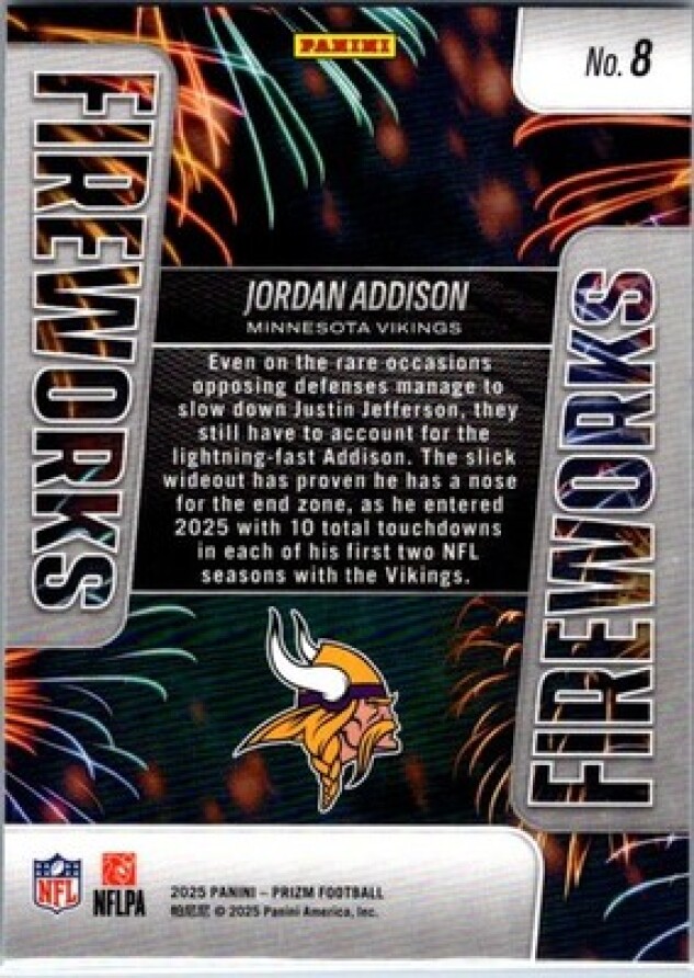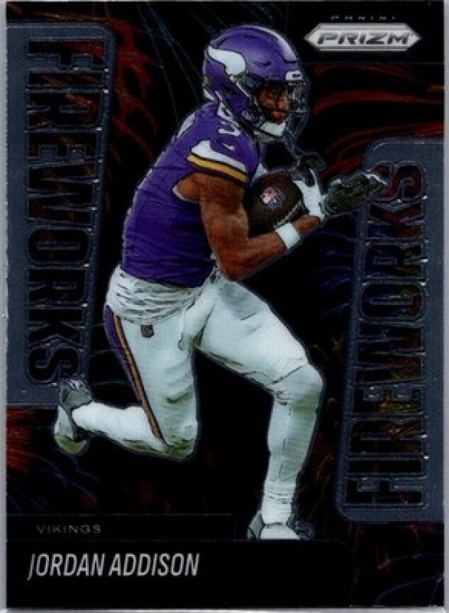 This is a nice example of a 2025 Panini Prizm #8 Jordan Addison Fireworks