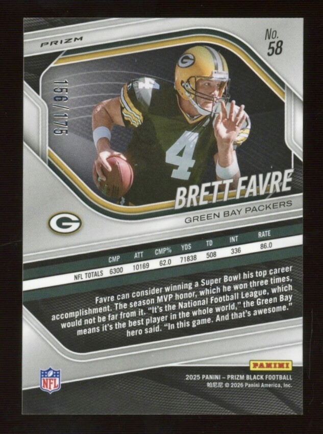 2025 Panini Prizm Black - Brett Favre #58 TRUE WHITE PRIZM LEGENDS SSP /175 PACKER UNIFORM