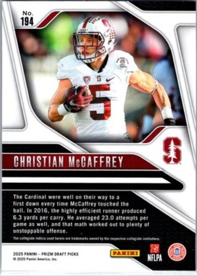 This is a nice example of a 2025 Panini Prizm Draft Picks #194 Christian McCaffrey