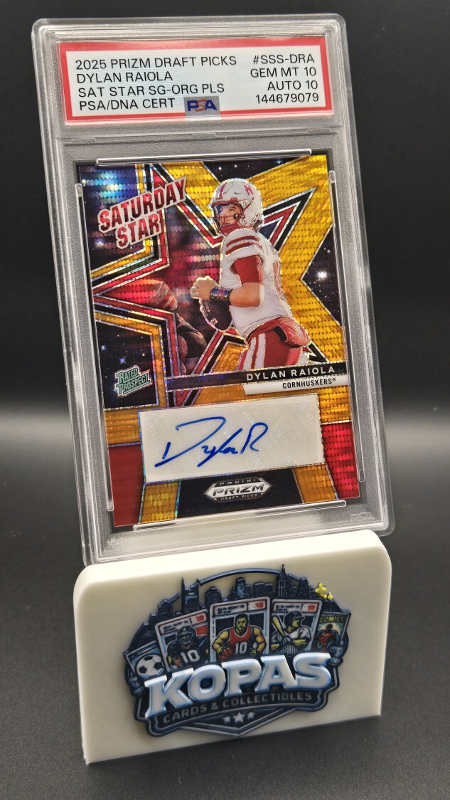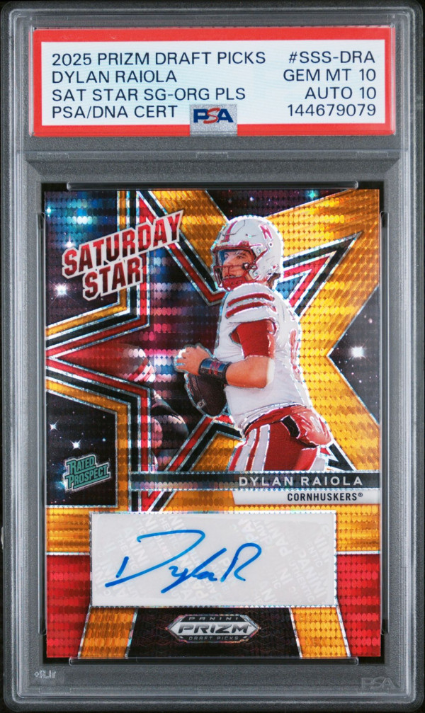 This is a 2025 Panini Prizm Draft Picks Dylan Raiola Saturday Star Orange Pulsar Autographed card numbered out of only 35 for the QB from the Nebraska Cornhuskers, who has now transferred to the Oregon Ducks. Rated a Gem Mint 10 by PSA, this card is truly one to own for collectors of the quarterback and fans alike.