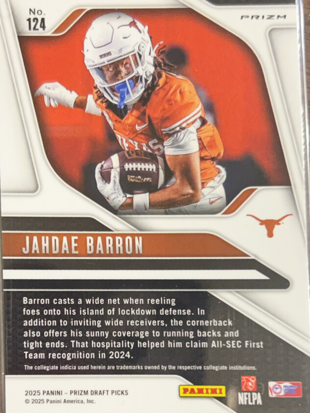 You are purchasing a 2025 Panini Prizm Draft Picks Jahdae Barron #124 Purple RC. You will receive the exact item in the photographs. Thank you for looking.