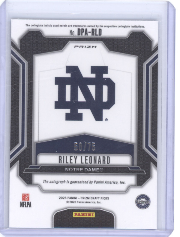 You are purchasing a 2025 Panini Prizm Draft Picks Riley Leonard #DPA-RLD Blue Autograph 50/75 RC. You will receive the exact item in the photographs. Thank you for looking.