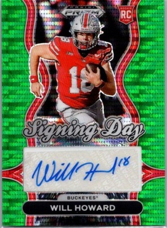 This is a nice example of a 2025 Panini Prizm Draft Picks #SD-WHD Will Howard Signing Day Green Pulsar