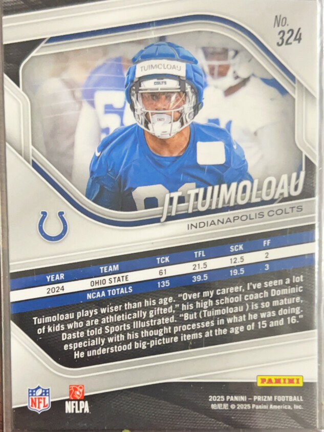 You are purchasing a 2025 Panini Prizm Football JT Tuimoloau #324 RC. You will receive the exact item in the photographs. Thank you for looking.