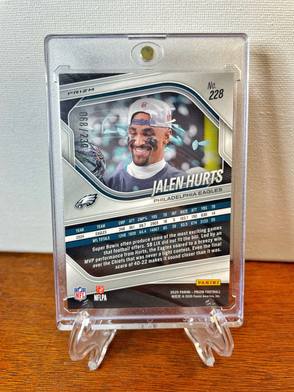 This is (1) 2025 Panini Prizm JALEN HURTS Blue Wave #/230 Super Bowl Trophy Eagles #228. Thank you for checking out my listing!
