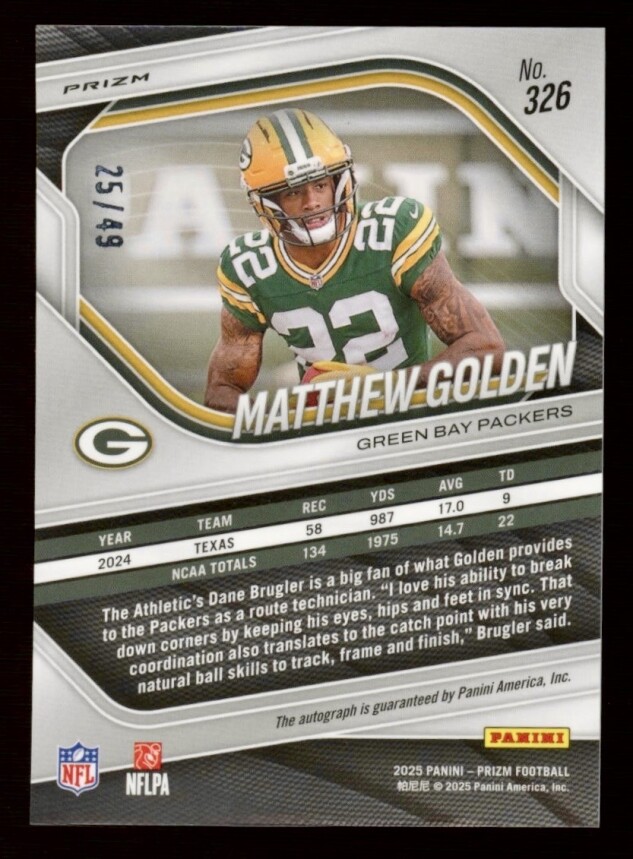 2025 Panini Prizm - Matthew Golden Rookie #326 True Rookie Autograph PURPLE POWER PRIZM /49 SSP