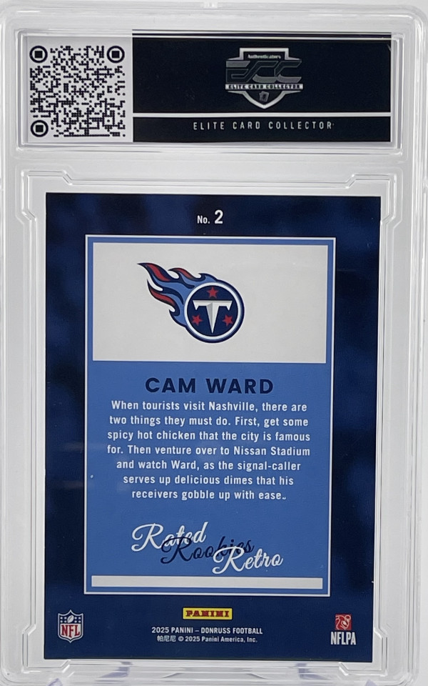 The 2025 Panini Donruss Cam Ward #2 Rated Rookie Retro trading card features the Tennessee Titans player in his rookie season. This officially licensed NFL card is made of high-quality card stock and is graded a perfect 10. The retro design adds a unique touch to this English-language card, making it a valuable addition to any football card collection. With its original insert set and autograph authentication, this Cam Ward rookie card is a must-have for fans of the Tennessee Titans and football enthusiasts alike.
