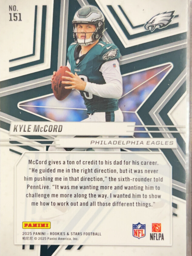 You are purchasing a 2025 Panini Rookies & Stars Kyle McCord #151 RC. You will receive the exact item in the photographs. Thank you for looking.