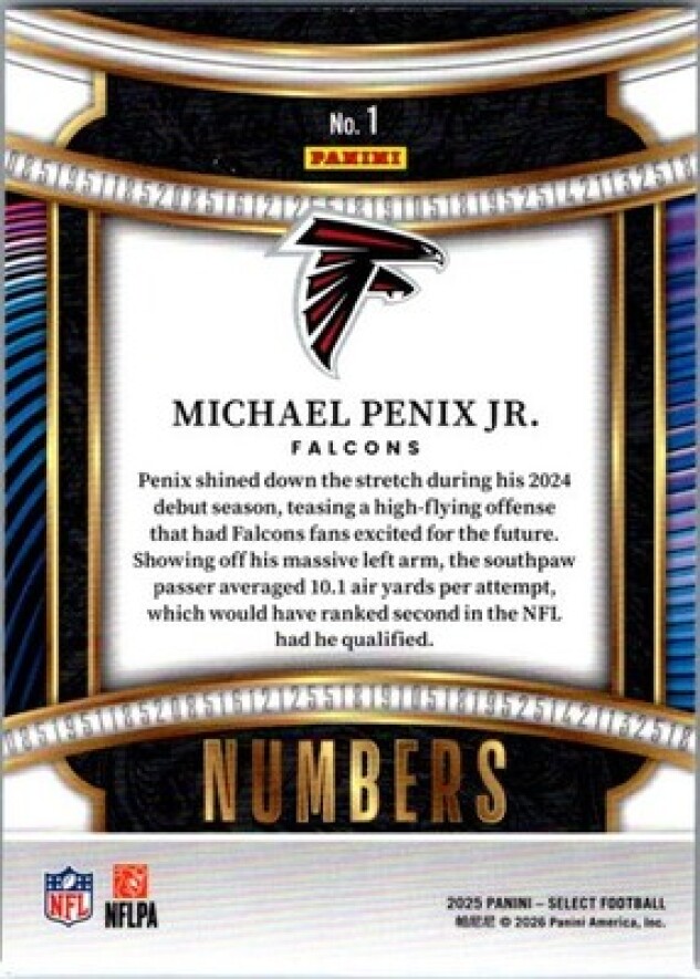 This is a nice example of a 2025 Panini Select #1 Michael Penix Jr. Select Numbers