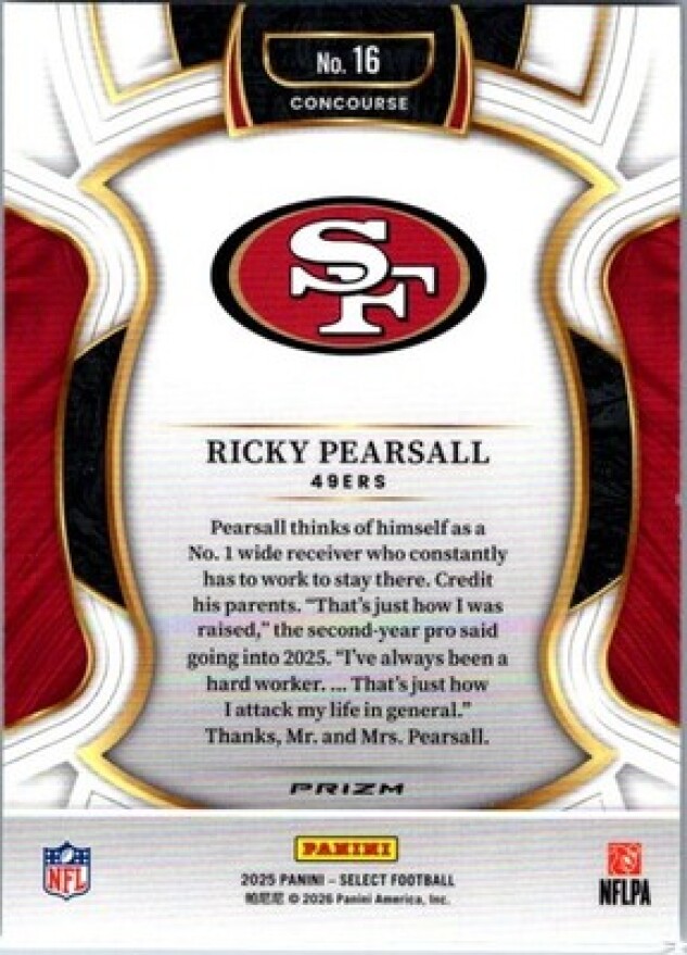This is a nice example of a 2025 Panini Select #16 Ricky Pearsall Silver Prizm