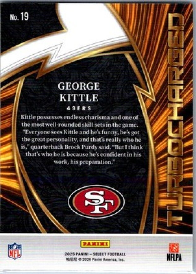 This is a nice example of a 2025 Panini Select #19 George Kittle Turbocharged