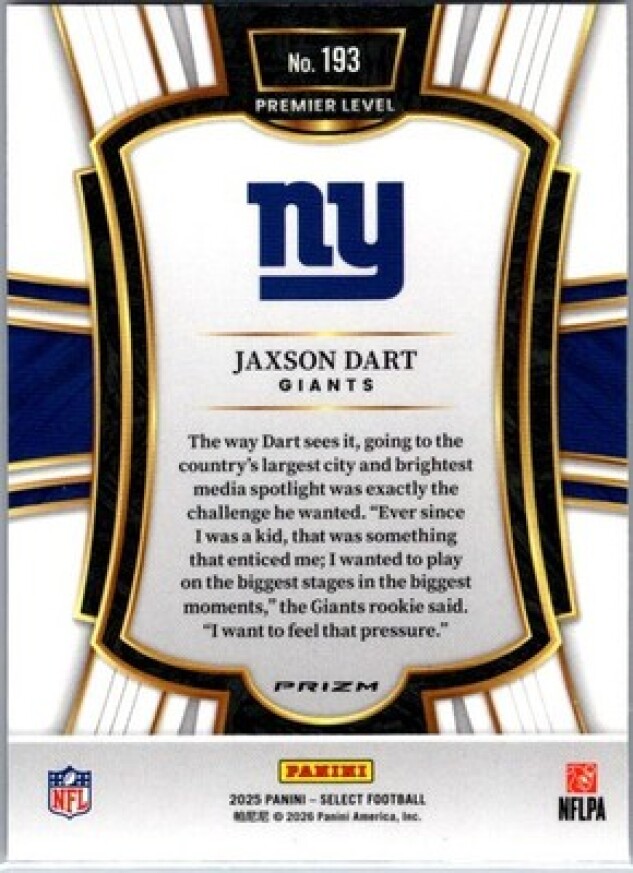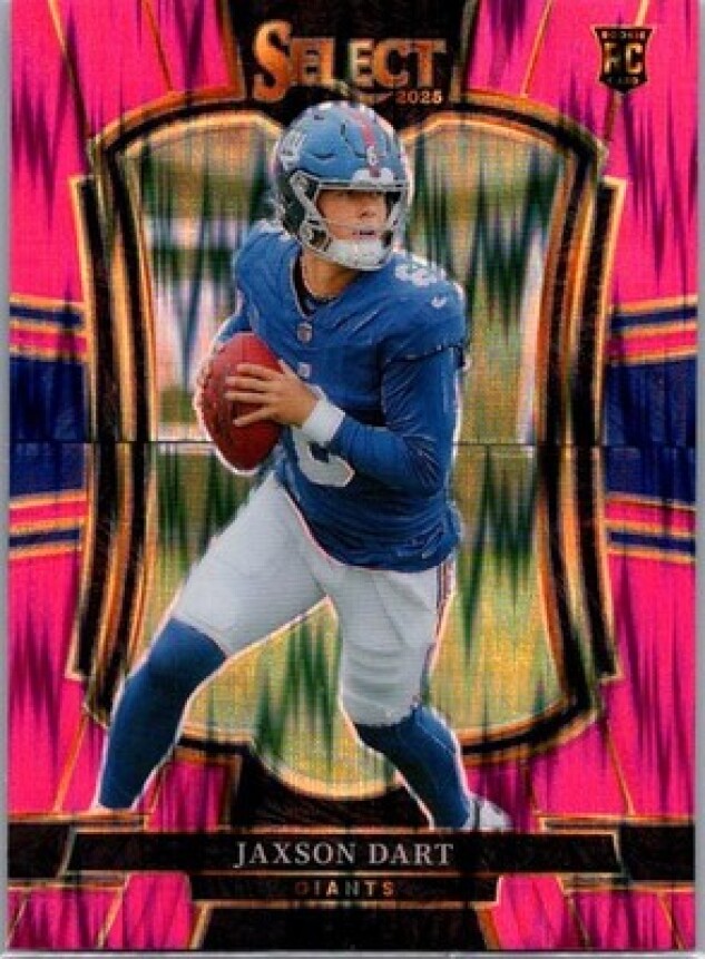 This is a nice example of a 2025 Panini Select #193 Jaxson Dart Pink Prizm Shock