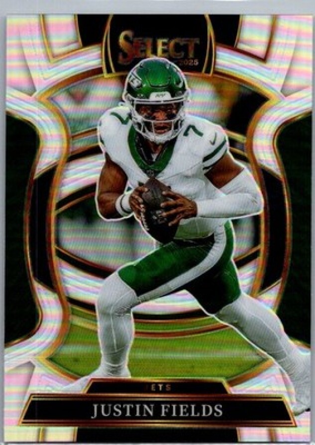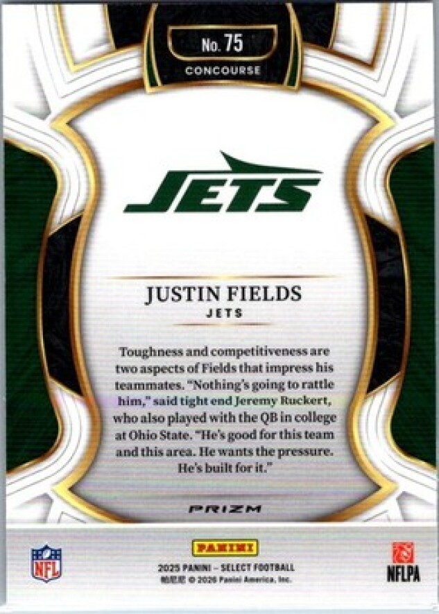 This is a nice example of a 2025 Panini Select #75 Justin Fields Silver Prizm