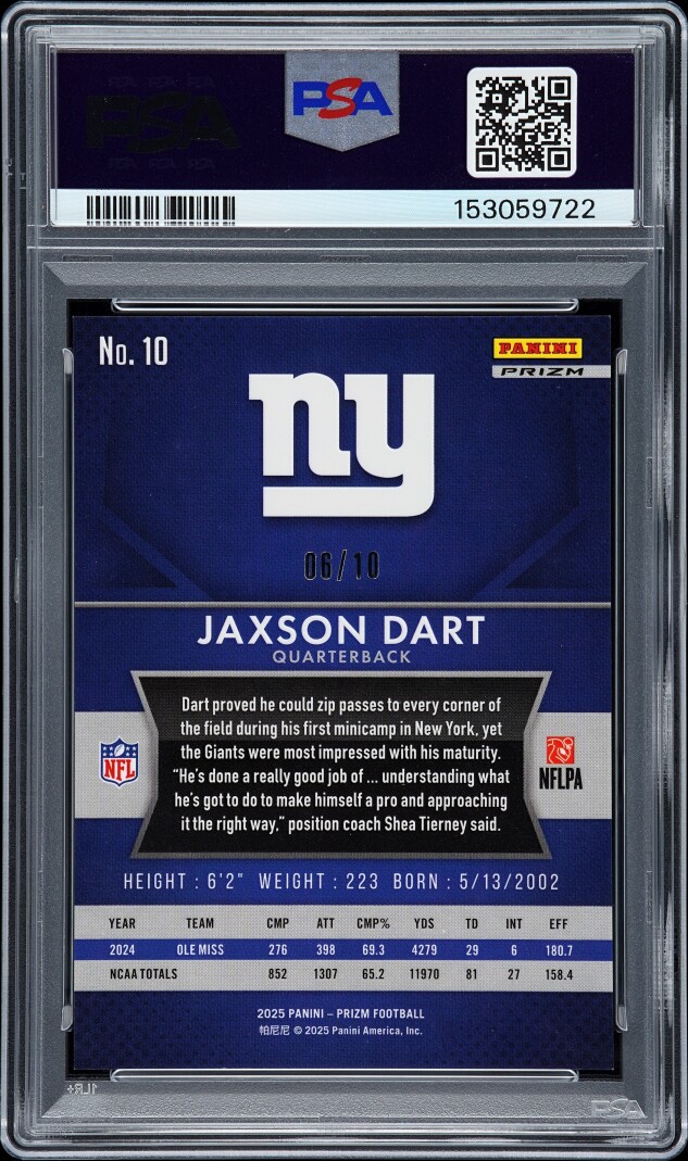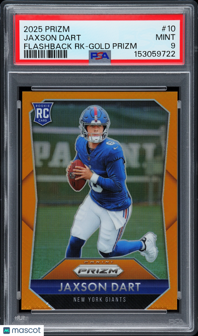 You are purchasing a 2025 Prizm Jaxson Dart Flashback Rookie Gold 6/10 #10 PSA 9. You will receive the exact item in the photographs. Thank you for looking.