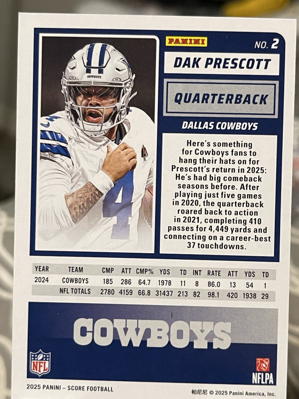 2025 Score Dak Prescott #2 Red Parallel Insert Dallas Cowboys