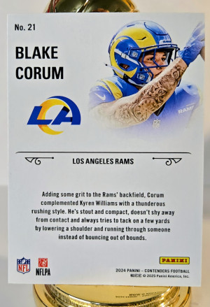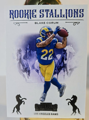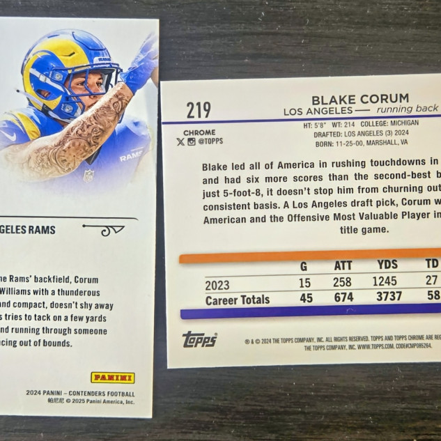 The Blake Corum 2 Card Lot includes a Panini Contenders Rookie Stallion and a Topps Chrome Sepia trading card featuring the rookie athlete from the Los Angeles Rams. Both cards are part of the National Football League (NFL) sports trading card collection for the 2024 season. The lot offers collectors a unique mix of features such as parallels and inserts, making it a valuable addition to any football card collection.