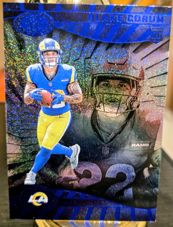 The product is a 2024 Panini Illusions Trophy Collection Dots trading card featuring rookie player Blake Corum from the LA Rams in the NFL. This card is part of a base set and has a parallel variety design, making it a highly collectible item for football fans. With a focus on showcasing unique designs and limited edition parallels, this trading card is in near mint condition and is sure to be a prized possession for any collector of sports trading cards.
