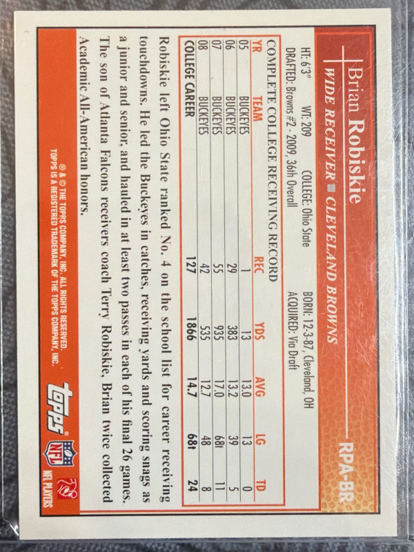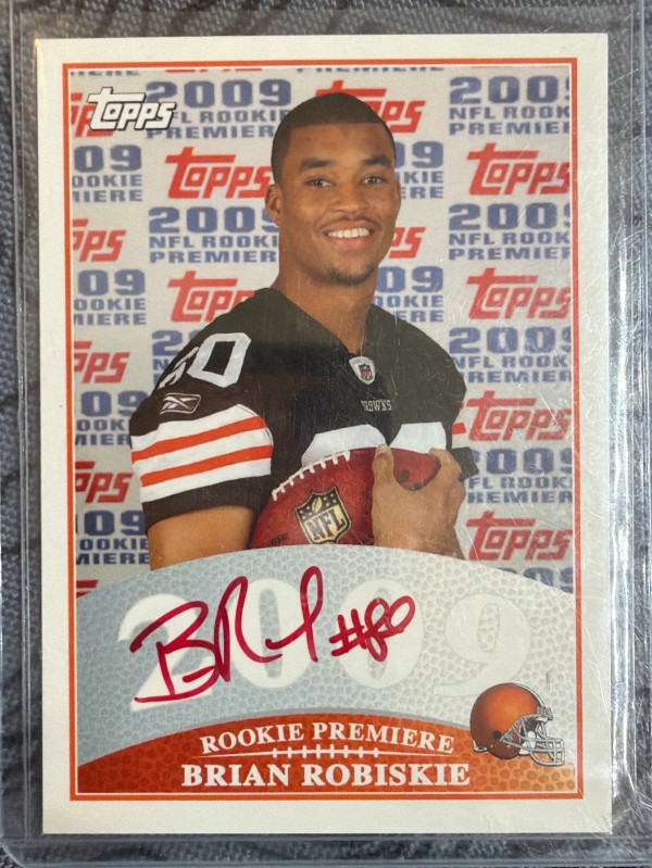Classic 2009 Topps Rookie Premiere autograph featuring Brian Robiskie. Clean on-card auto with a great throwback Topps design—nice pickup for Browns fans, rookie-auto collectors, or vintage-era NFL sets.