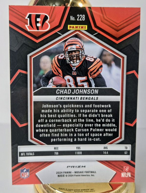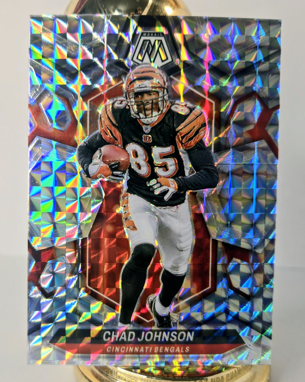 The product is a 2024 Panini Mosaic Mosaic Prizm trading card featuring Chad Johnson of the Cincinnati Bengals. This card is part of the National Football League (NFL) set and showcases a parallel/variety design. As a collectible item from the sports trading card category, it appeals to fans and collectors of football memorabilia. Chad Johnson's iconic status in the league, combined with the eye-catching design of the Mosaic Prizm card, makes it a sought-after addition to any football card collection.
