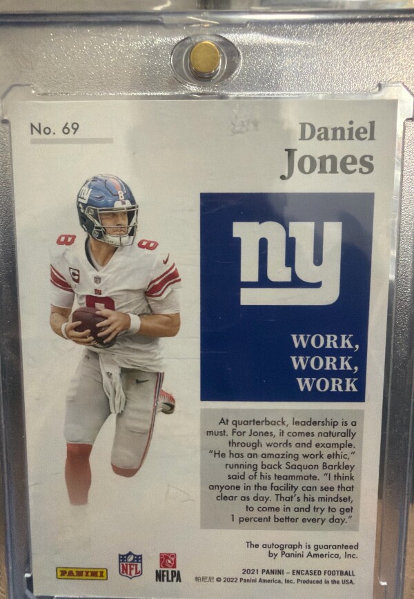 Up for sale is a sharp Daniel Jones autographed patch card numbered 07/10 — a super low-serial collectible for Giants fans and NFL collectors.
