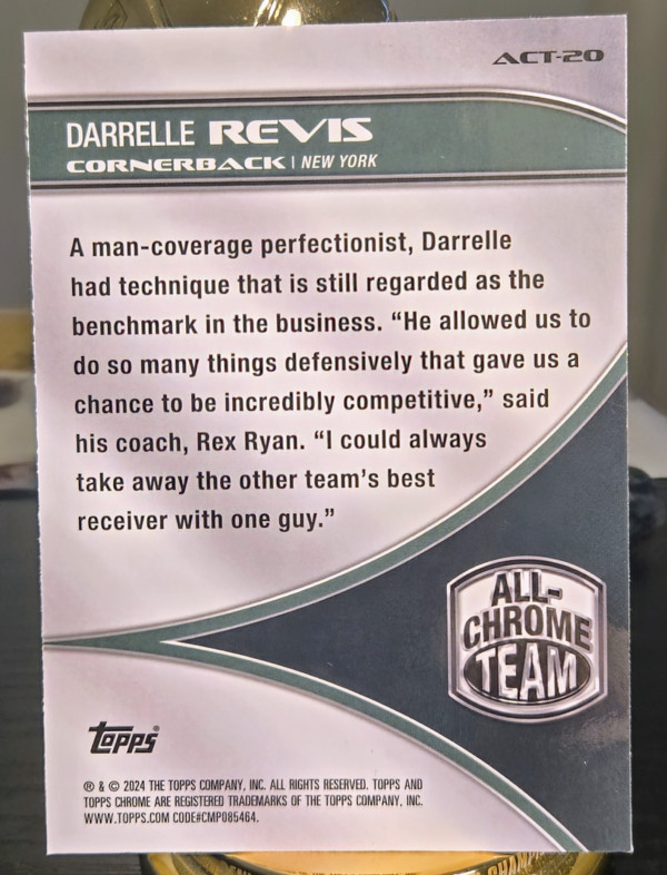 The product is a 2024 Topps Chrome All Chrome Team trading card featuring Darrelle Revis from the New York Jets. This sports trading card is part of the National Football League (NFL) and is ungraded with a near mint or better condition. The card is a special insert from the All-Chrome Team set, with the player's number being ACT-20. Made by Topps, this card is a must-have for football fans and collectors looking to add a unique piece to their collection.