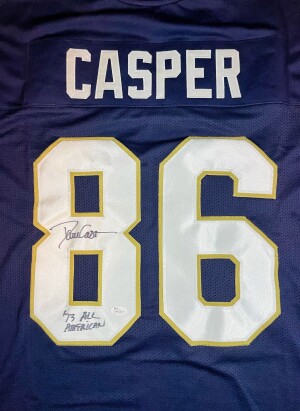 This is (1) DAVE CASPER Signed Notre Dame Custom Jersey that includes a “‘73 All American” Inscription and a JSA Certificate of Authenticity.