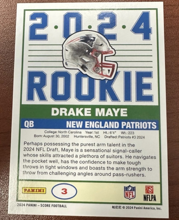Drake Maye 2024 Panini Score Football Rookie Card #3