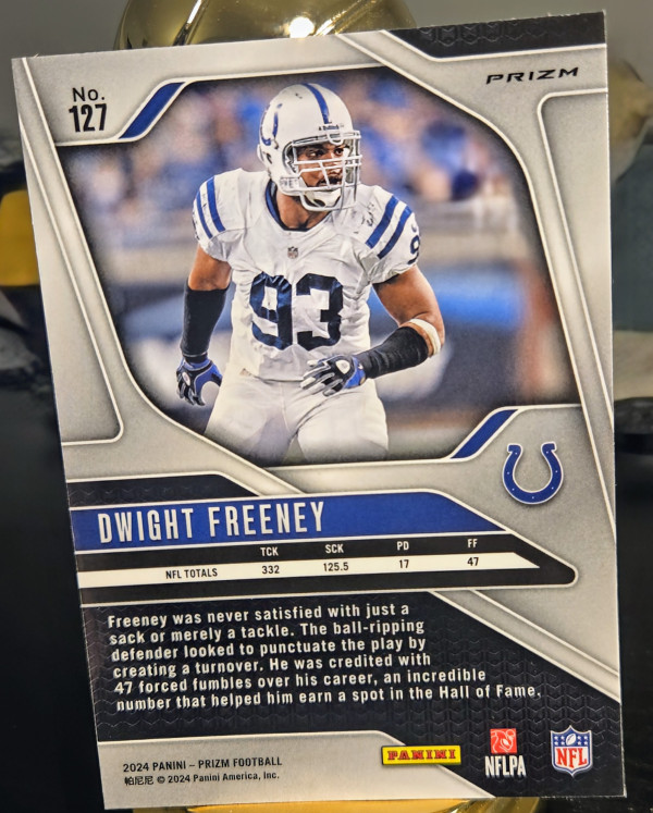 The product is a 2024 Panini Prizm Orange Ice trading card featuring Dwight Freeney from the Indianapolis Colts in the National Football League (NFL). This card is a rare parallel variety with the card number 127, part of the base set for the 2024 season. As a highly sought-after collectible for football fans and card enthusiasts, this item holds value due to its association with a Hall of Fame player and unique design within the Panini Prizm series.