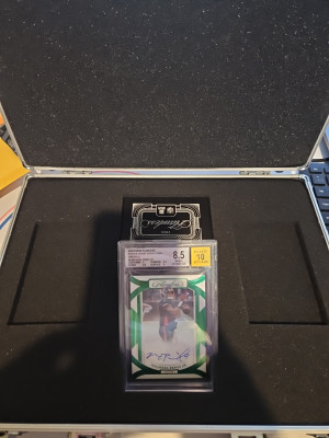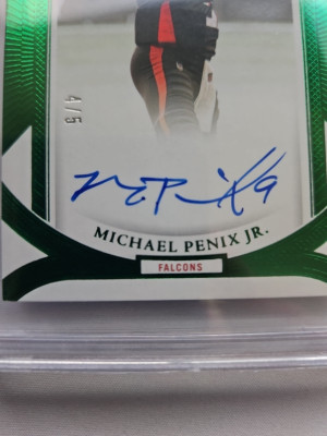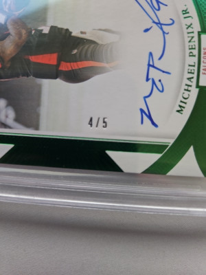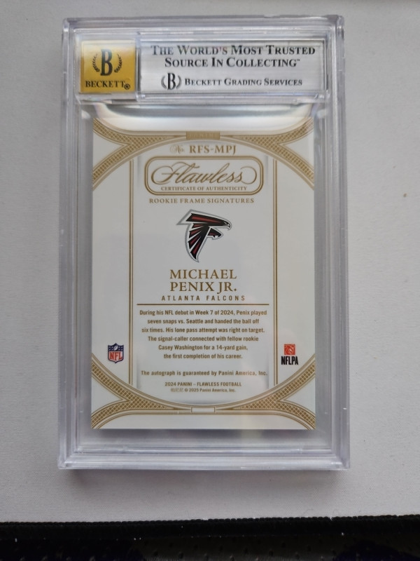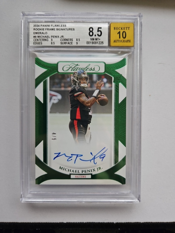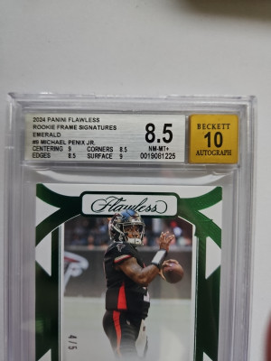 Absolutely clean Flawless Emerald Autographed Michael Penix Jr 4/5. Graded 8.5 and a 10 for the signature. Should be a higher grade but it's a thi k card. 2 9's and 2 8.5 grades with a 10 for the signature. A must have for any collection. When this guy comes back this card with blow up. Get it now. I will send it in the Flawless Case as well.