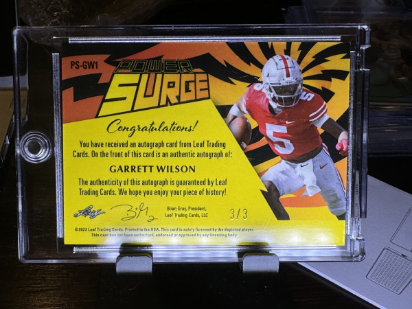Looking for a low numbered card of a good player? Look no further. For sale is a NFL Pro Set Garrett Wilson Power Surge. Only 3 of these cards were made. This is card 3 of 3.