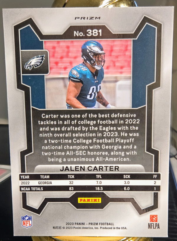 The product is a 2023 Panini Prizm Orange Lazer trading card featuring Jalen Carter from the Philadelphia Eagles. This sports trading card is an original piece made of card stock, with a standard size and in near mint or better condition. It is a part of the National Football League (NFL) set for the 2023 season and includes features such as parallel/variety and rookie designation. Manufactured by Panini in the United States, the card is a desirable collectible for fans of football and trading card enthusiasts.