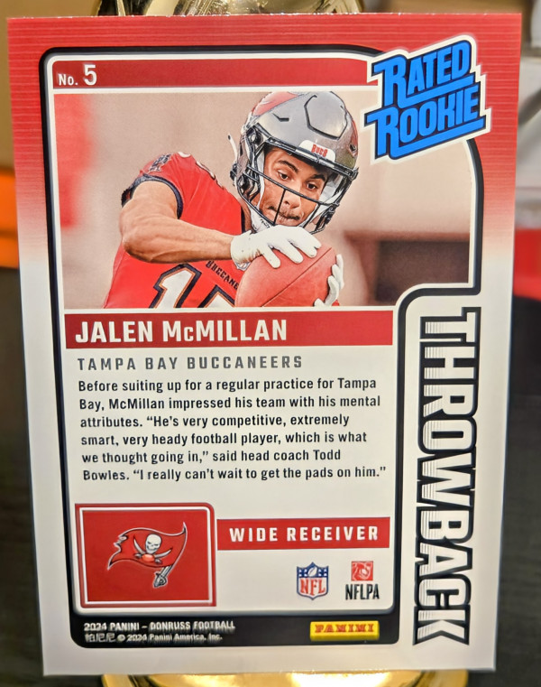 The product is a 2024 Panini Donruss Football Rated Rookies Throwback #5 trading card featuring Jalen McMillan from the Tampa Bay Buccaneers. This near mint or better card is part of the NFL league and is a rookie insert card, making it a desirable collectible for football fans and card collectors alike. With the traditional throwback design and association with a popular NFL team, this card offers a unique and eye-catching addition to any sports memorabilia collection.