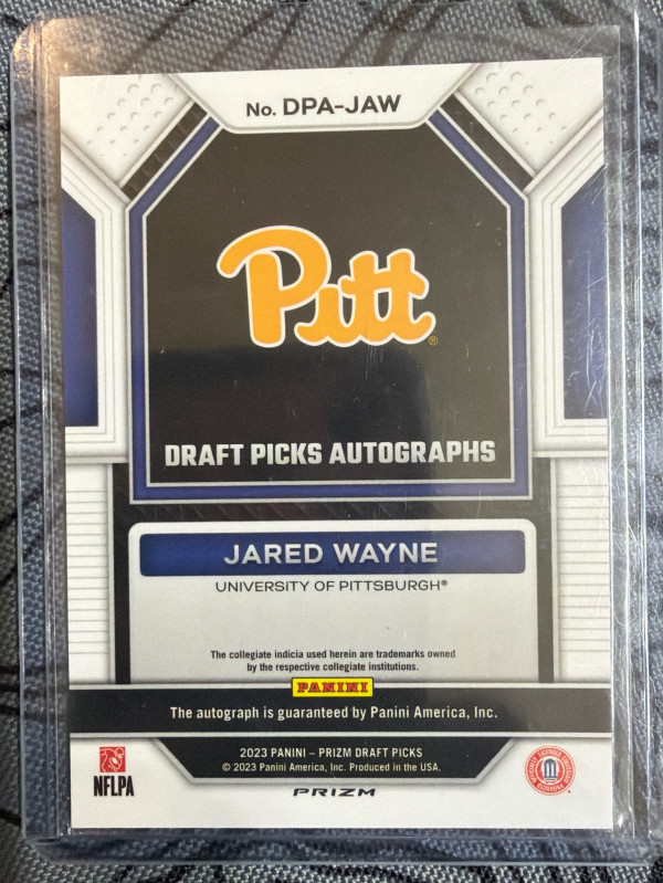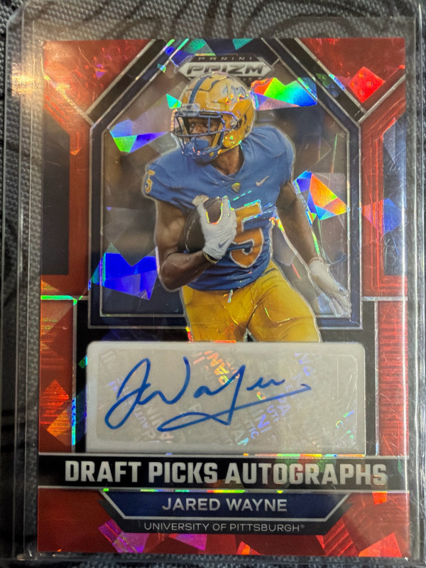 Sharp-looking Jared Wayne Draft Picks Autographs card featuring a bold on-card signature. Red Prizm gives this one serious pop โ perfect for Pitt collectors, draft class builders, or auto hunters.