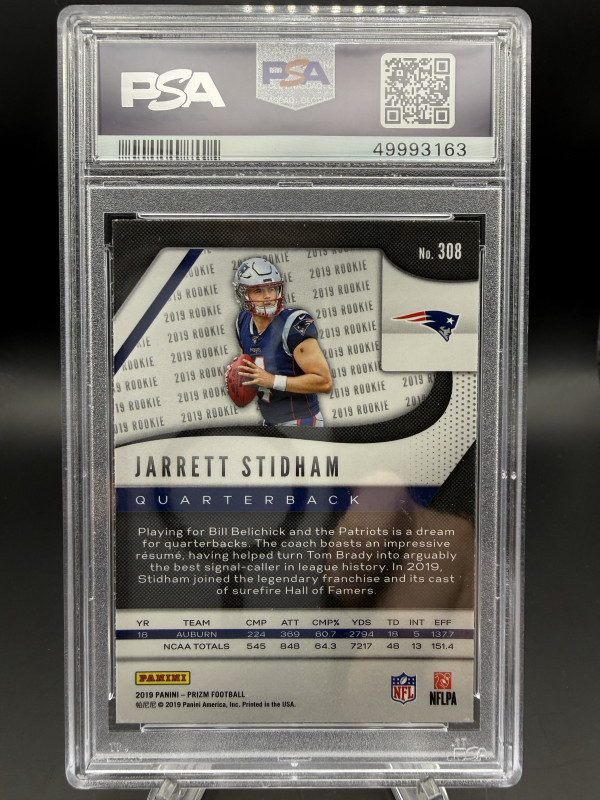 Jarrett Stidham 2019 Rookie Card from when he was drafted by the New England Patriots.