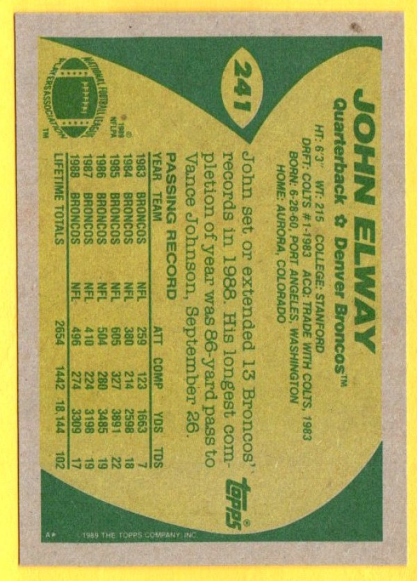 John Elway #241 – 1989 Topps – Denver Broncos – NFL Hall of Fame QB