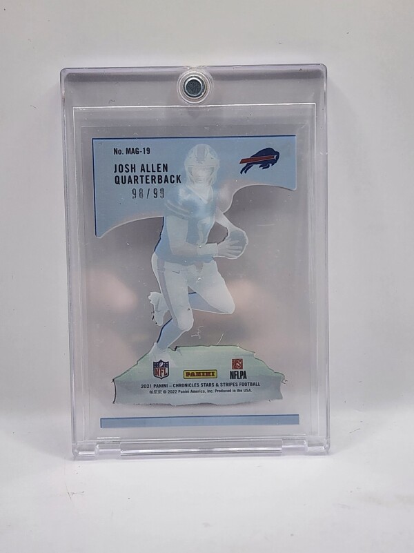 The product is a 2021 Panini Chronicles Stars and Stripes trading card featuring Josh Allen from the Buffalo Bills. This particular card is part of the Magnitude insert set, with a limited print run of only 99 copies. The card is made of standard card stock and has a thickness of 35 Pt. It is an original card manufactured by Panini in the United States for the National Football League (NFL) season of 2021. This collectible item is a valuable addition to any sports trading card collection, especially for fans of football and the Buffalo Bills.