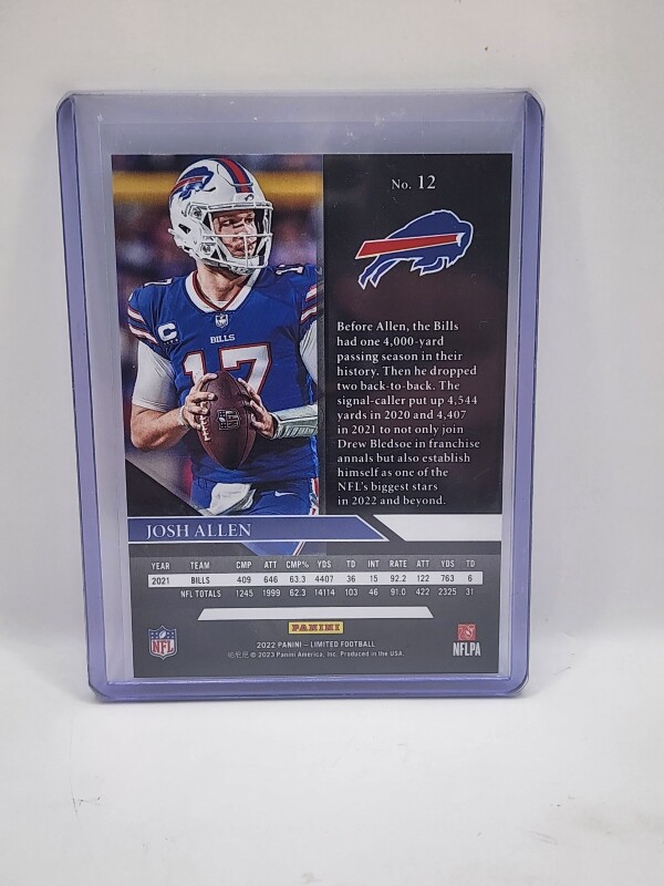 The product is a 2022 Panini Limited trading card featuring Josh Allen of the Buffalo Bills. This card is part of a limited print run of 99 and is made of standard card stock with a thickness of 35 Pt. It is an original card manufactured by Panini and includes special features such as being serial numbered and part of the 2022 Panini Limited set. The card is in English and is a valuable collectible for fans of the National Football League.