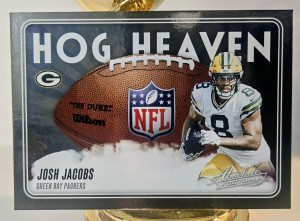 The product is a 2025 Panini Absolute Hog Heaven trading card featuring Josh Jacobs of the Green Bay Packers in the National Football League (NFL). This sports trading card is part of the Hog Heaven insert set, adding a unique element to the card. As a base card with the card number HH-JJS, it is a sought-after collectible for fans and collectors alike.