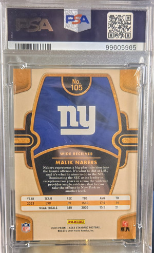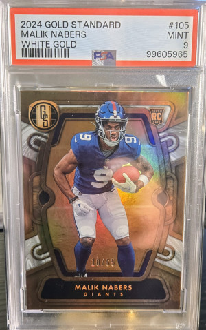 The product is a set of two 2024 Panini Gold Standard White Gold trading cards featuring Malik Nabers, a football player from the New York Giants. One of the cards is serial numbered out of 65 and has been graded a PSA 9. Additionally, the set includes a rookie card of Malik Nabers. These collectible cards are part of the National Football League (NFL) league and are manufactured by Panini, known for producing high-quality sports trading cards. The cards are special features such as being parallel and insert cards, making them desirable for collectors and fans.