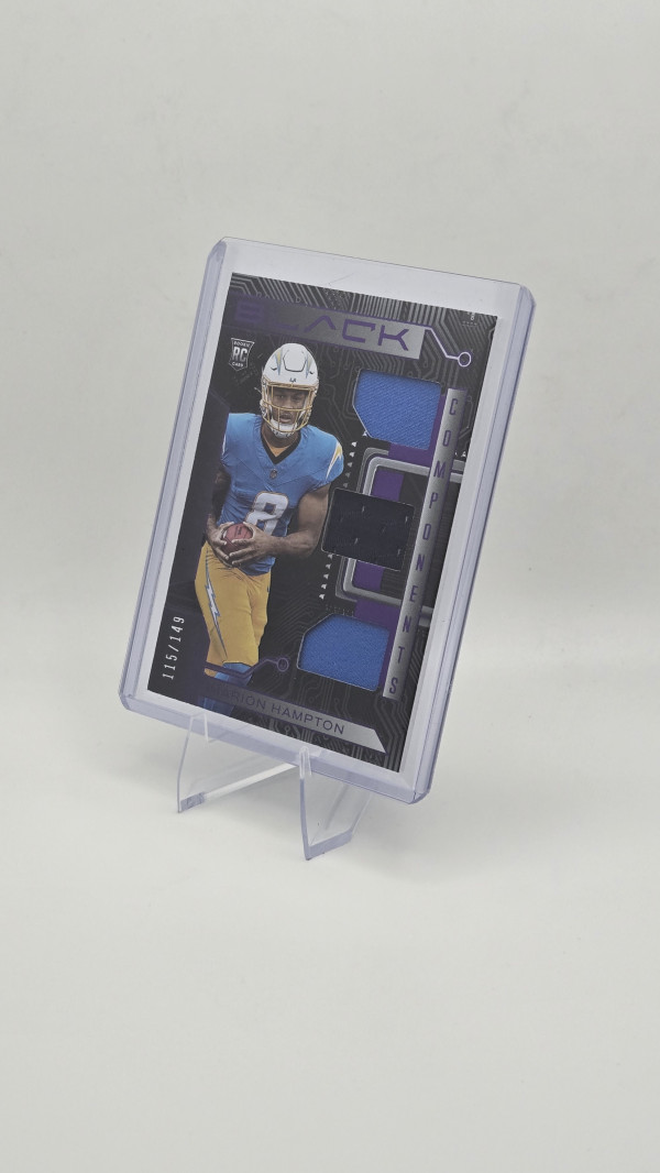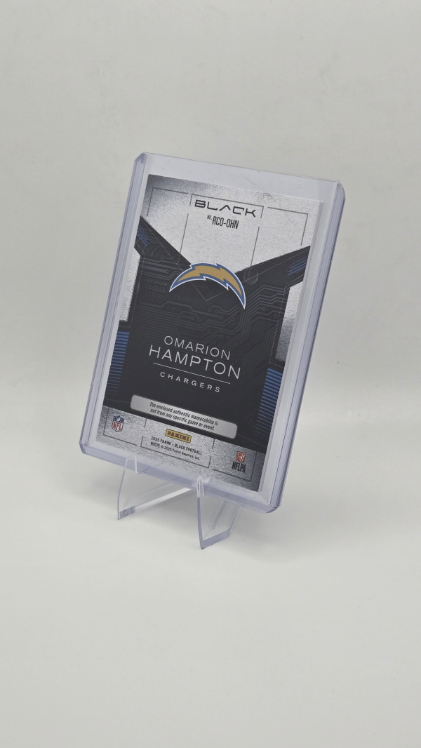 The product is a 2025 Panini Black rookie trading card featuring Omarion Hampton of the Los Angeles Chargers. This card is a triple patch version, with a print run of only 149 copies, making it a rare and valuable collectible for football fans and card enthusiasts. The card is in English and manufactured by Panini, known for producing high-quality sports trading cards. With its unique design and limited availability, this card is a sought-after item for collectors looking to add a special piece to their collection.