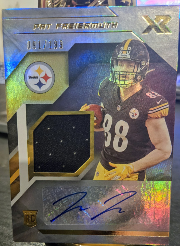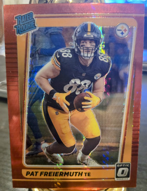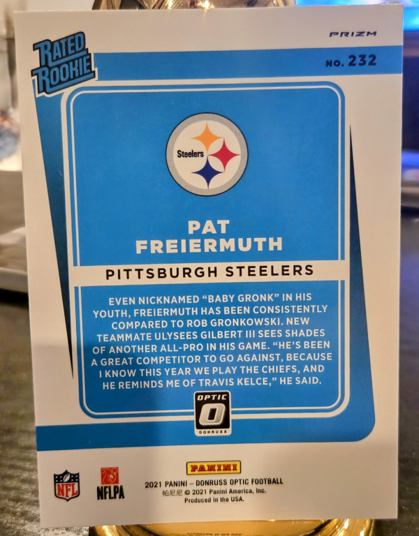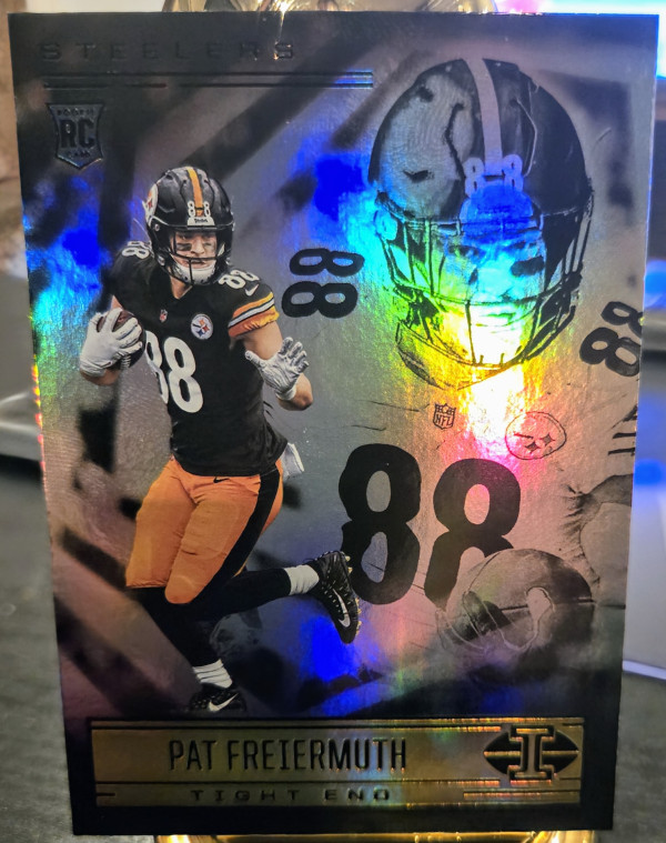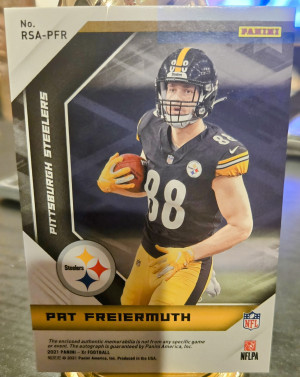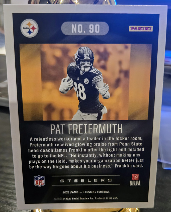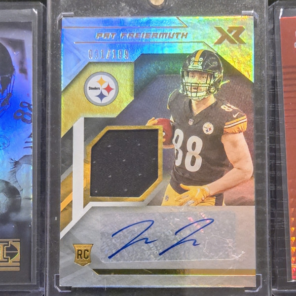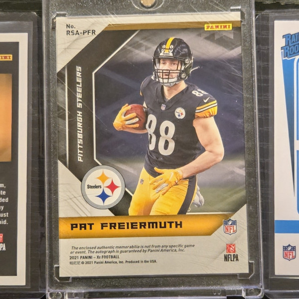 The product is a lot of three sports trading cards featuring football player Pat Freiermuth from the Pittsburgh Steelers. These cards are autographed by Freiermuth and come from different manufacturers such as Panini. The cards are part of the 2021 season and include features like serial numbering, base set inclusion, rookie designation, and parallel variations. This lot includes a 2021 Panini XR RPA /199 card, Illusions card, and a Donruss Optic Red Hyper card, all signed by Freiermuth.