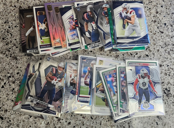 This is a 46 card team lot for the upcoming Superbowl contender New England Patriots. This includes many Drake Maye cards. Past stars like Gronkowski. Rookie cards for all the 2025 stars Treyvon Henderson, Kyle Williams and more. Brands include Topps and most of the Panini types. Donruss, Mosaic, Phoenix, Absolute, Elite, Score & more. Let me know if you have any questions.