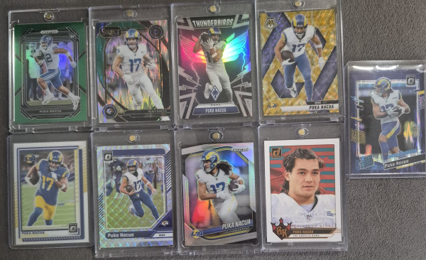 2023- Optic Purple Shock Rookie. 2023- Prizm Green Rookie. 2024- Prizm Black & Green Shock 2024- Gridiron Kings. 2024- Prizm Wave 20/300. 2025- Thunderbird. 2025- Mosaic Reactive Yellow. 2025- Prizm Silver. 2025- Optic